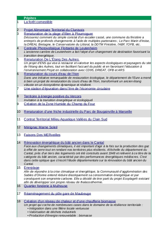 Listes des projets Pépites et liens